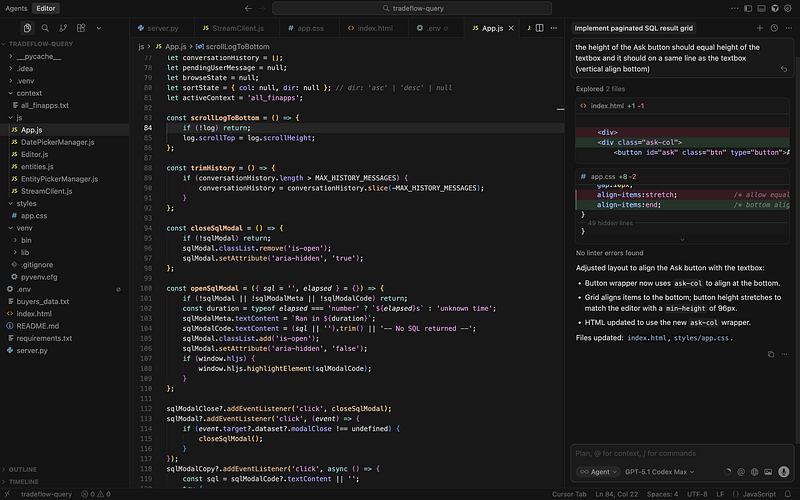 This is an entirely different experience compared to the copy-and-paste workflow with ChatGPT in a browser. I can simply stay inside the IDE, describe what I want, and let the AI perform the update automatically. The process feels natural and intuitive, like working with an assistant who already understands my code.