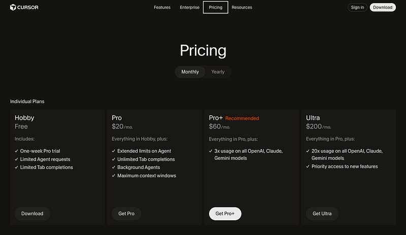 Cursor offers a seven-day free trial period for new users. After that, you need to subscribe to the Pro version for $20 per month to continue using the most powerful AI features.