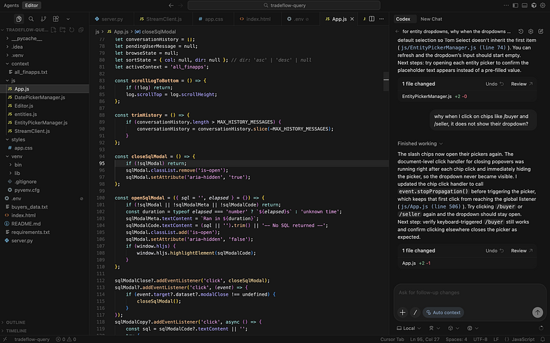 Switching to Cursor, combined with the OpenAI Codex extension, has completely changed the way I code. I no longer need to jump between my IDE and ChatGPT in a browser. Everything happens inside a single environment where the AI can read, understand, and modify my code directly. The workflow feels seamless and natural, like working with a smart assistant who is always available.